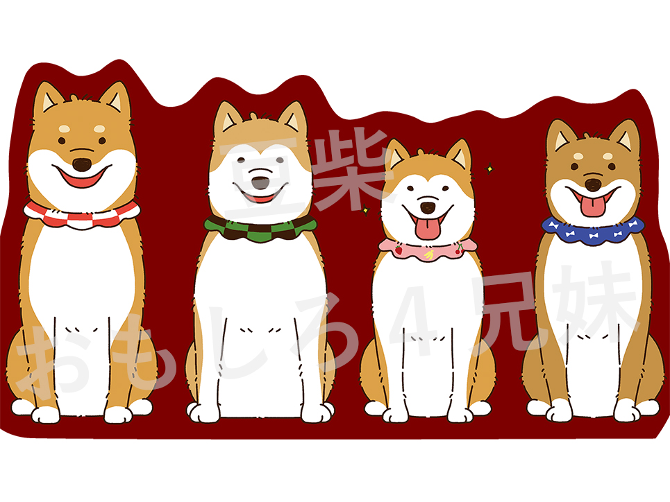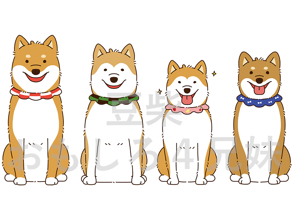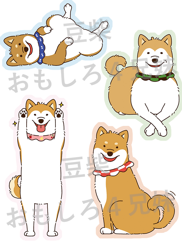 可愛い豆柴4兄妹ちゃんの特徴を捉えつつ、ほっこり愛されるようなデザインになるよう描きました。お座りポーズとそれぞれの得意ポーズの2種類。